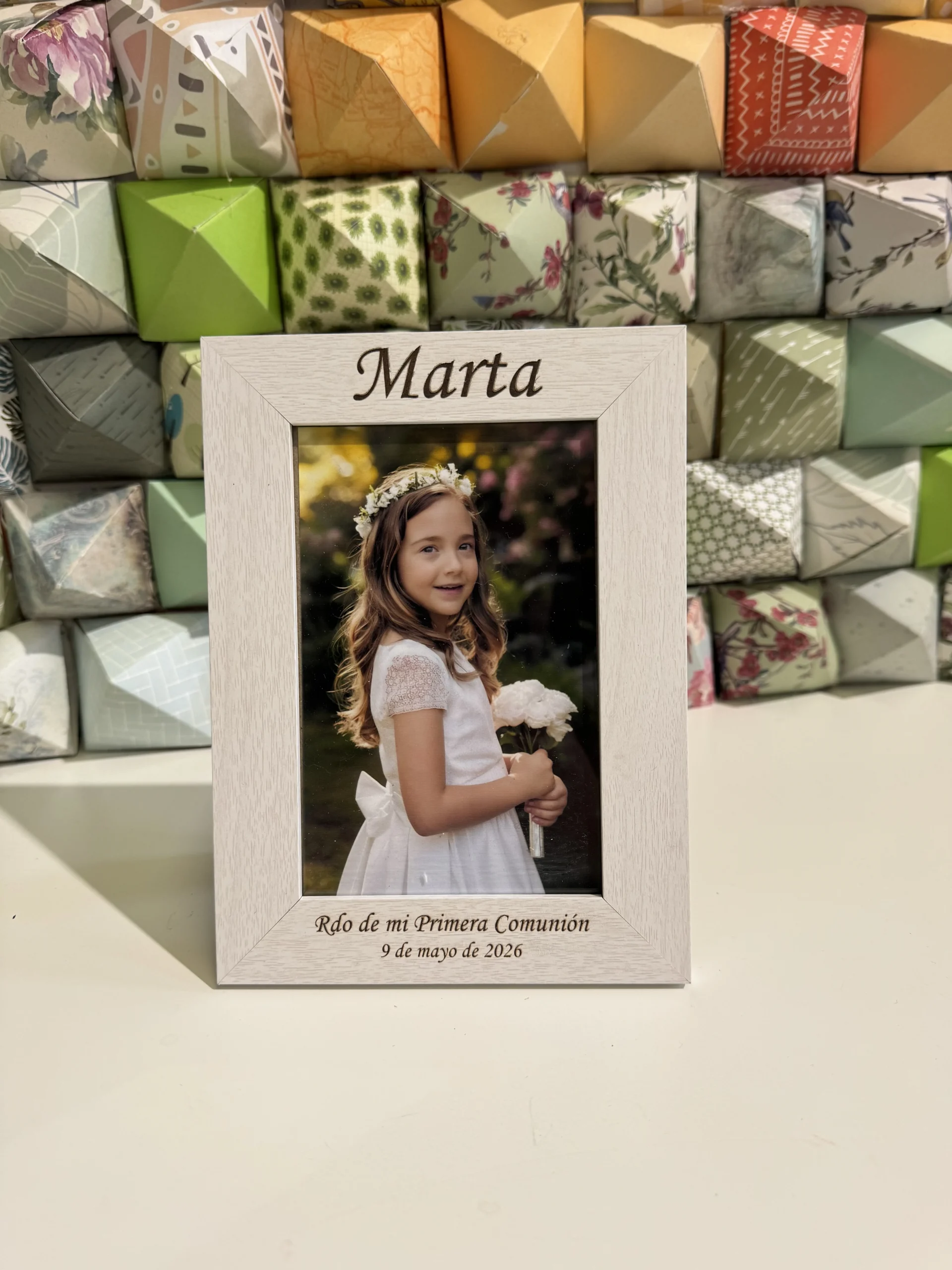 Portafotos personalizado. Fabricado en madera blanca, con cristal protector y soporte antideslizante con capacidad para fotos de 10x15cm