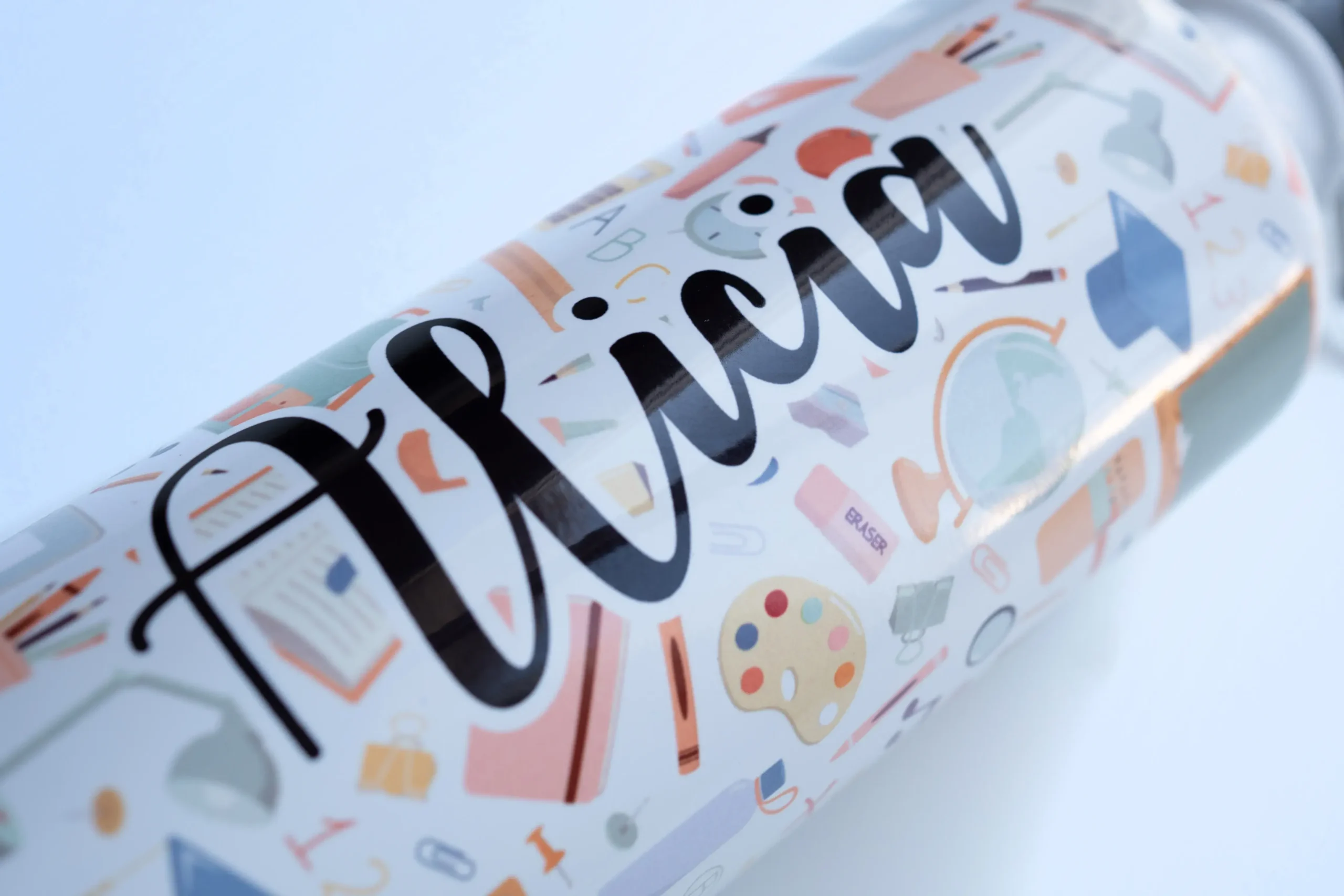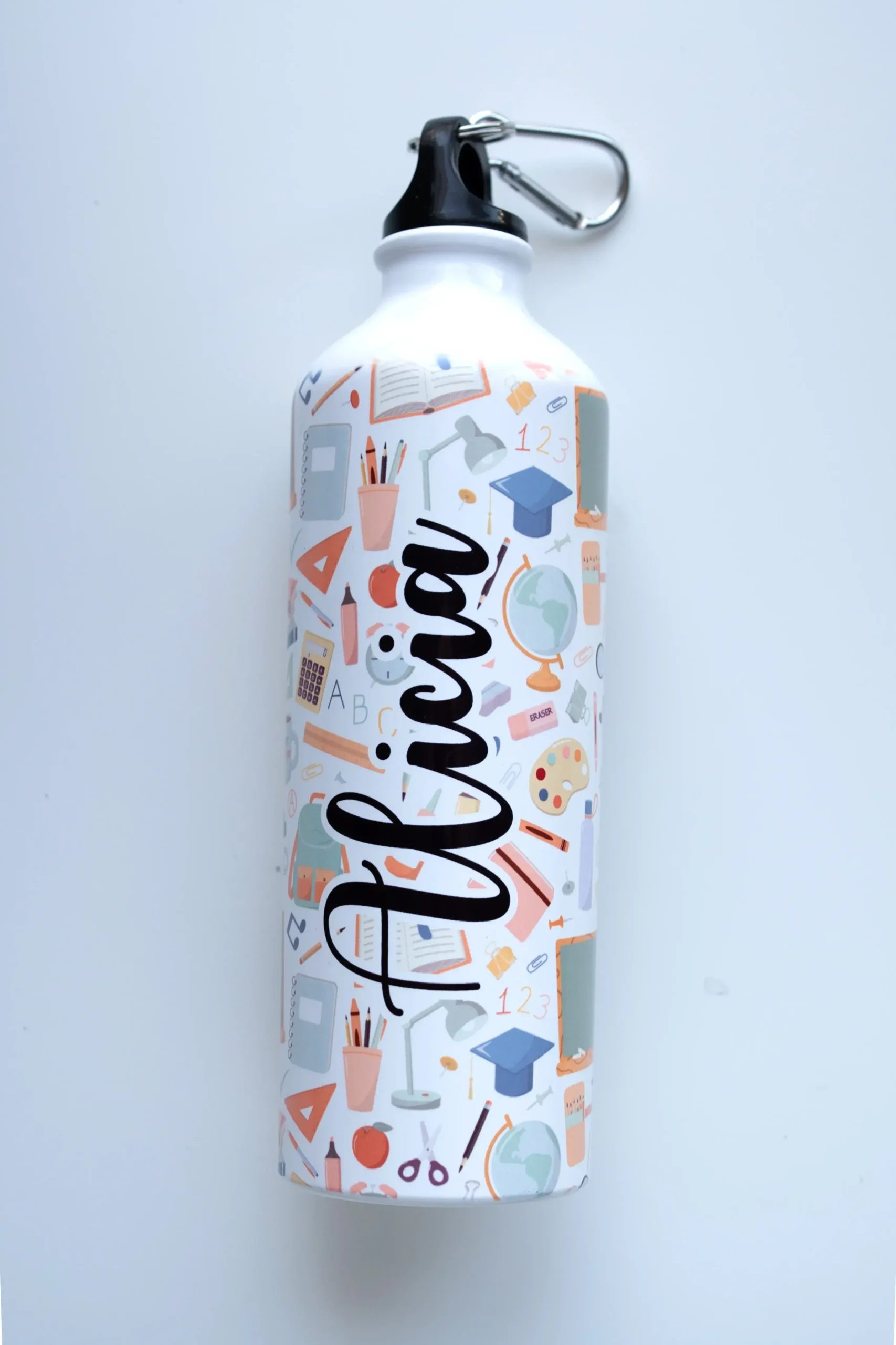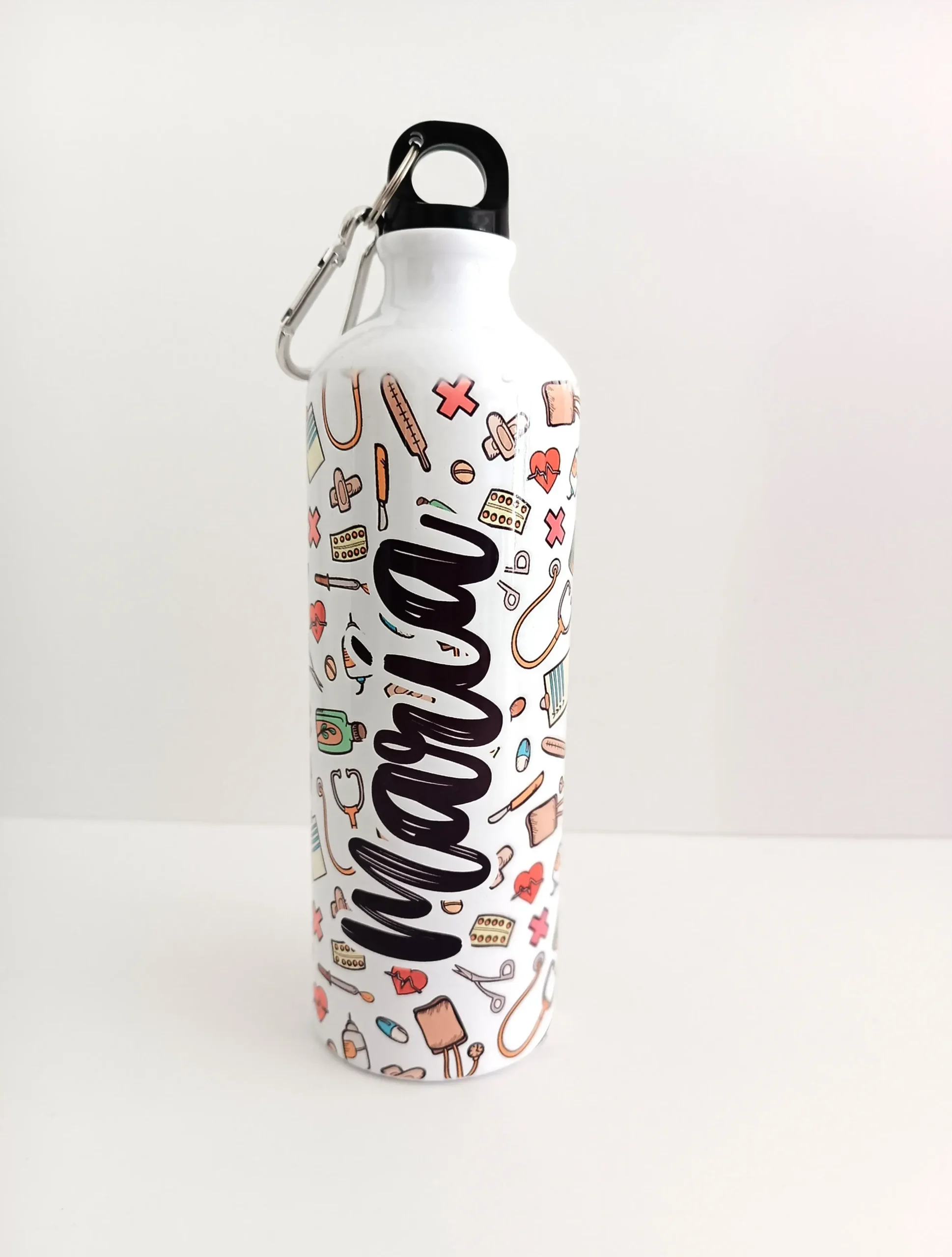 Bidón de 800ml de capacidad con cuerpo acabado en color blanco y tapón de seguridad a rosca con rosca y mosquetón metálico de transporte. Personalizado con sublimación