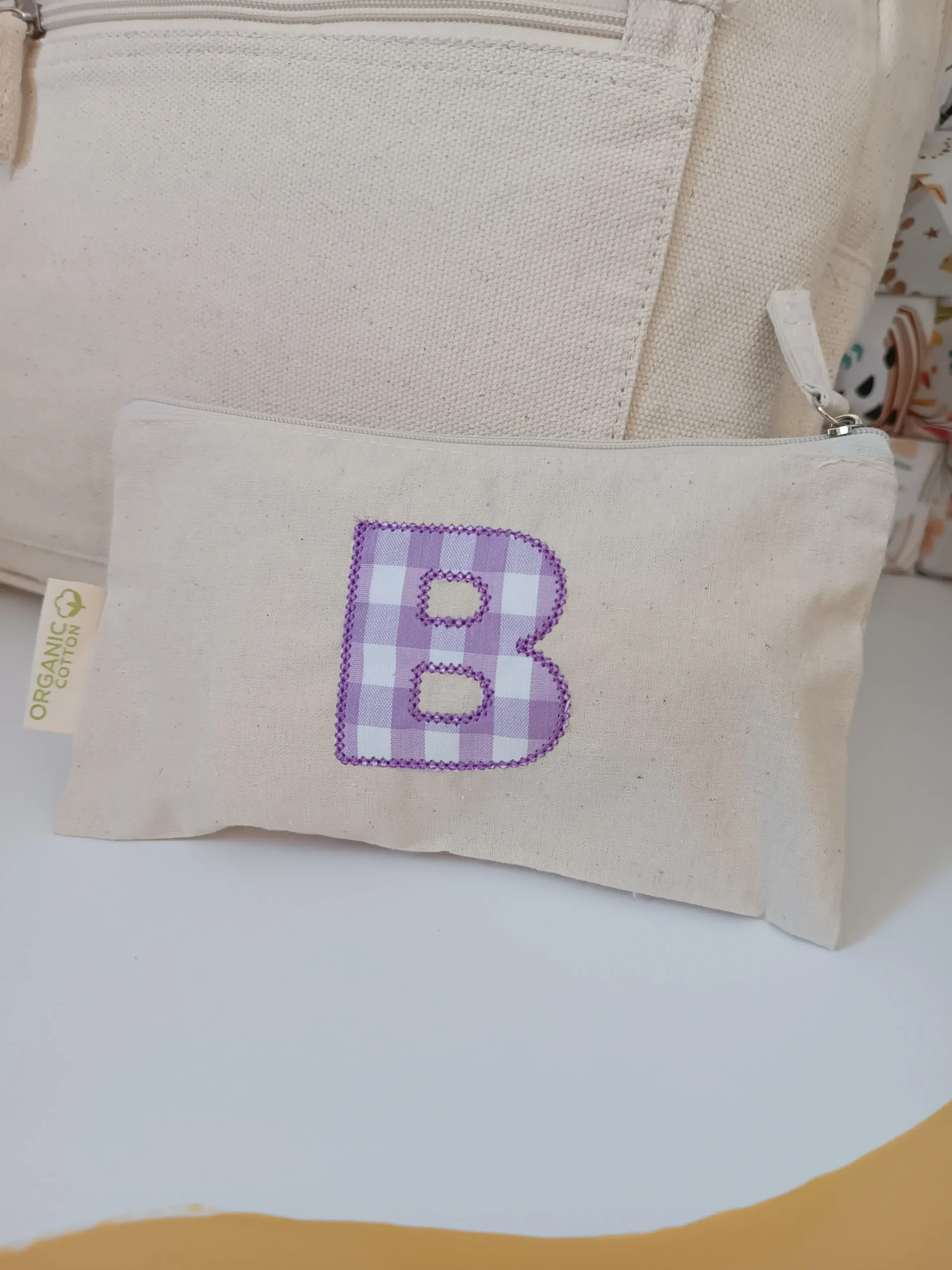 Estuche personalizado con inicial de vichy cosida en forma de aplique.