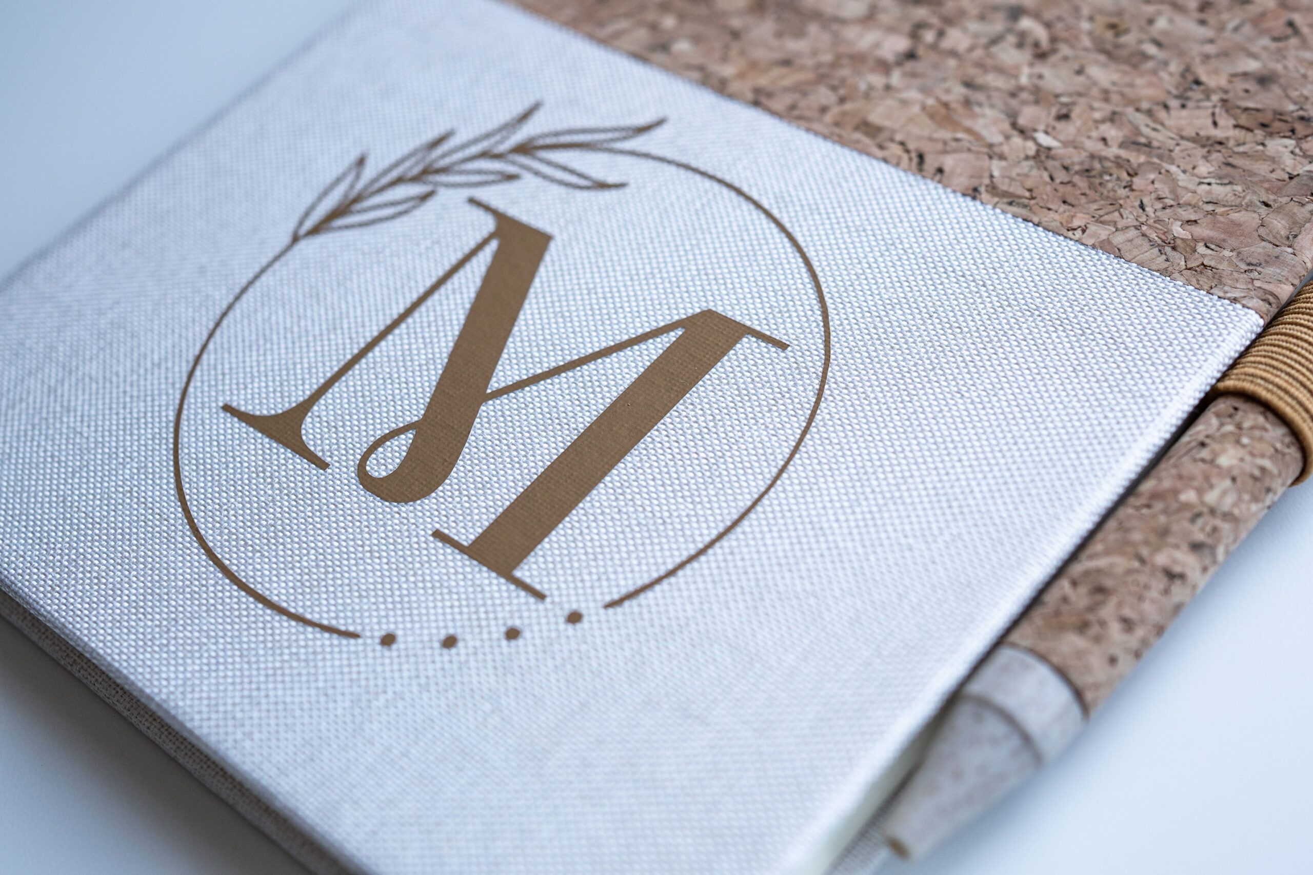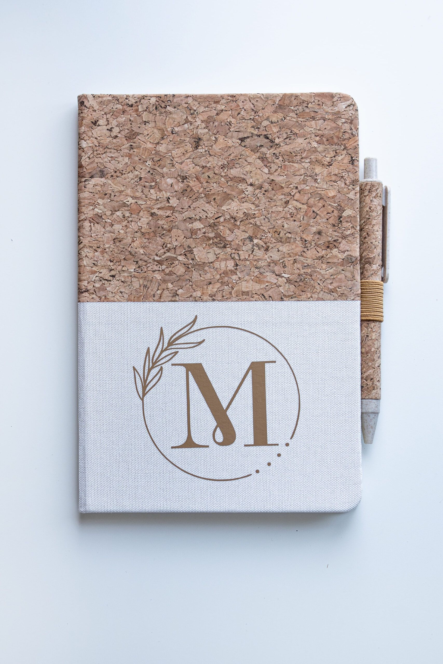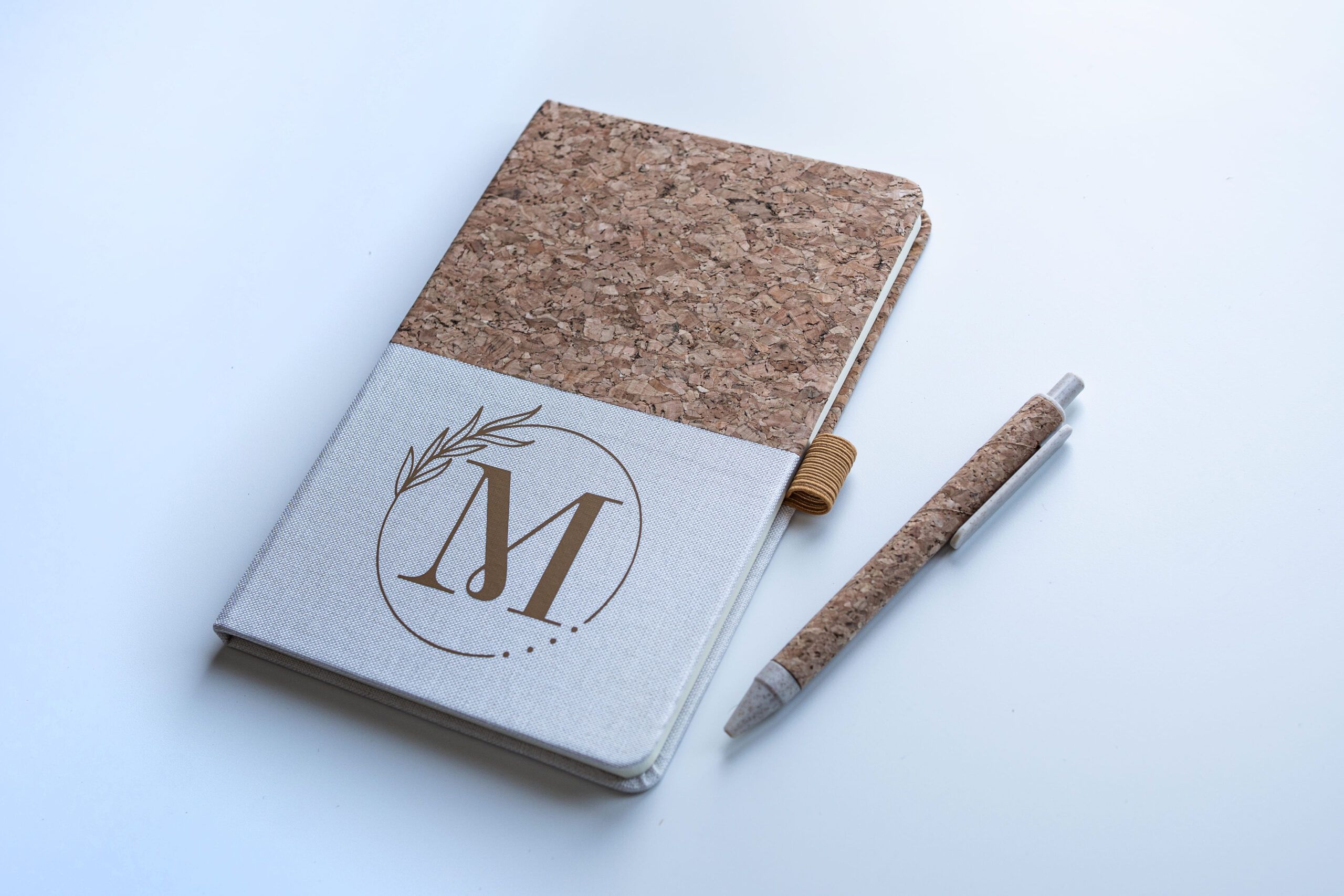Set de bloc de notas y bolígrafo. Bloc con tapas rígidas en corcho natural y algodón, con soporte para bolígrafo y 80 hojas lisas.
