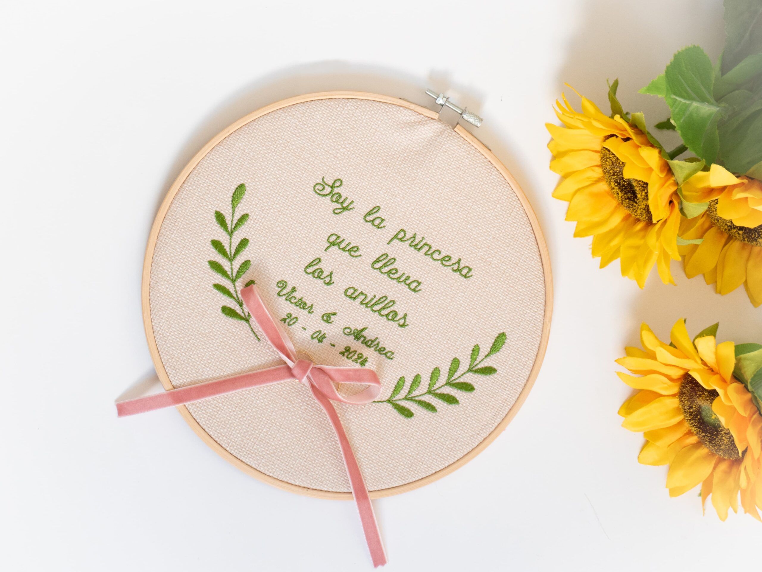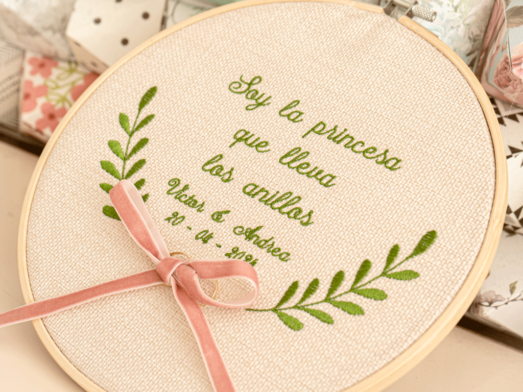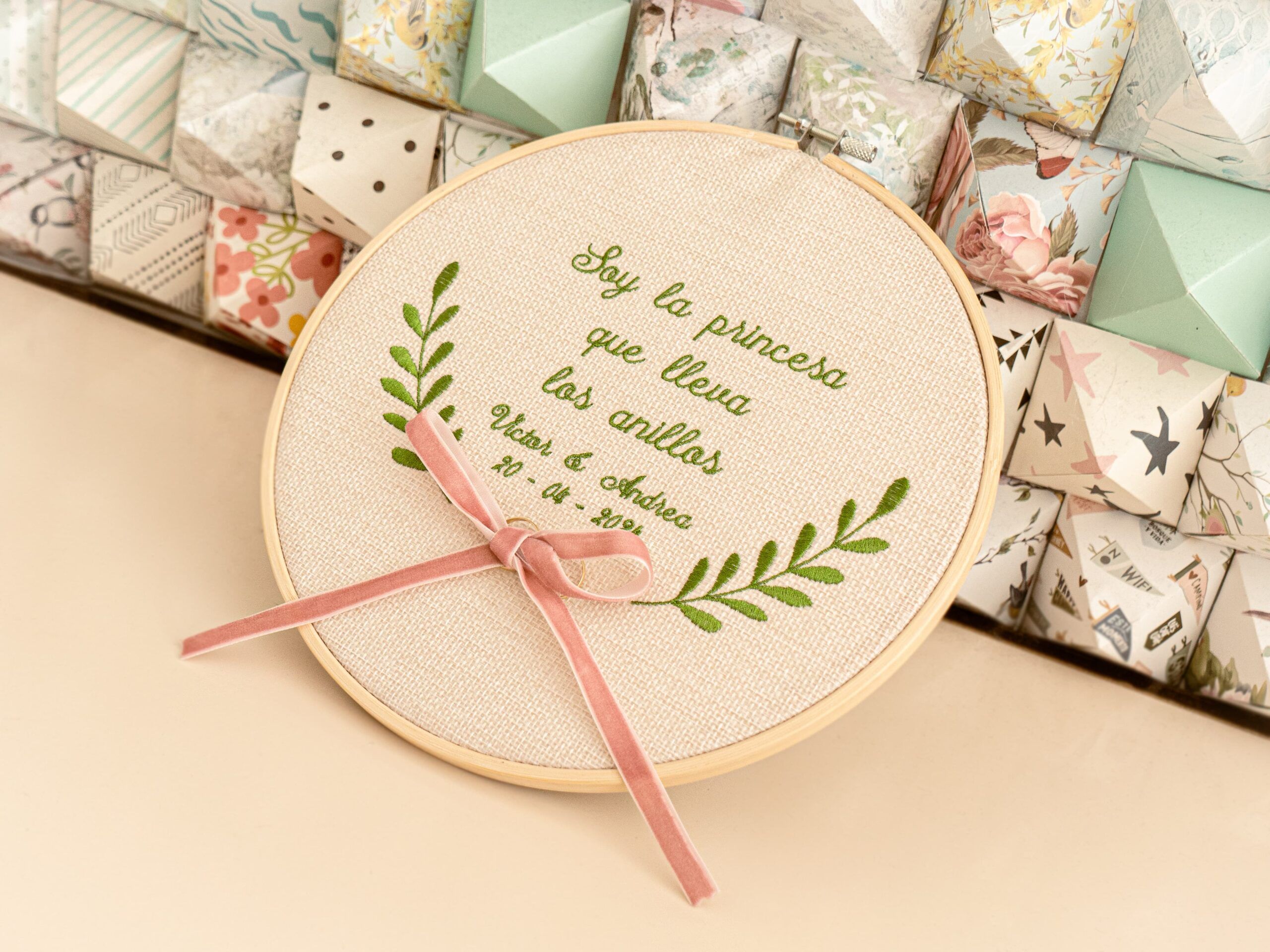 Elegante bastidor – portalianzas bordado de 23cm de diámetro.