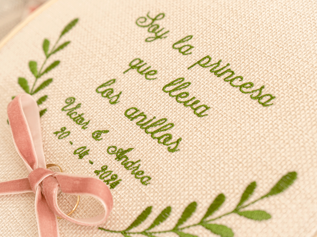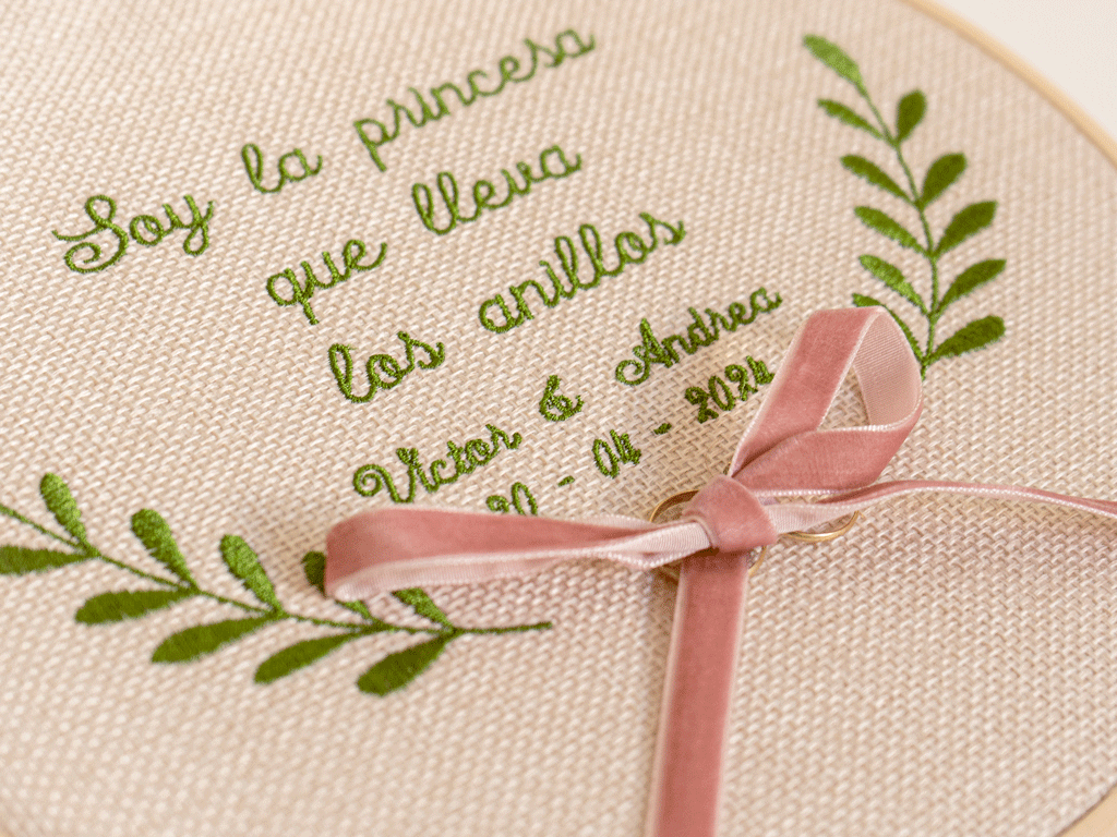 Incluye texto personalizado, y está rematado con una cinta (a elegir entre terciopelo y raso) para portar los anillos.